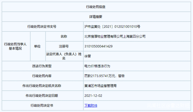 行政處罰書內容顯示,搜厚物業這7家分公司分別違法向終端用户多收取的電費約為158萬元至725萬元不等,其中違法加價多收點費金額最高的為北京搜厚物業管理有限公司上海第四分公司,被罰款2173萬元。