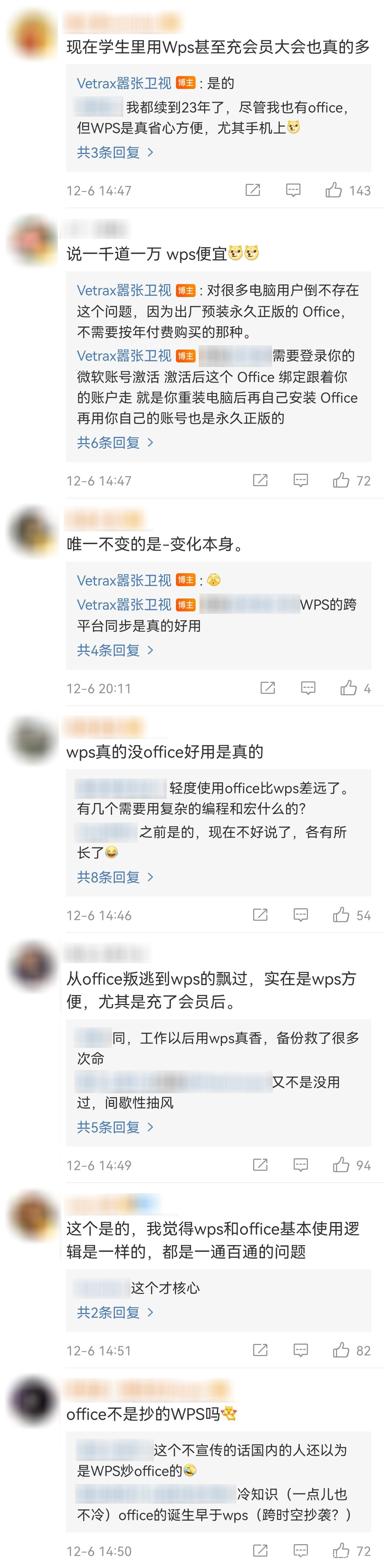 有網友表示,自己是從office“叛逃”到WPS的,完全真香,已經開通會員到了2023年;也有網友稱,雖然好用還是office好用,但如果沒有用到特別複雜的功能,WPS的方便完全吊打office,而且“備份救了很多次命”……
