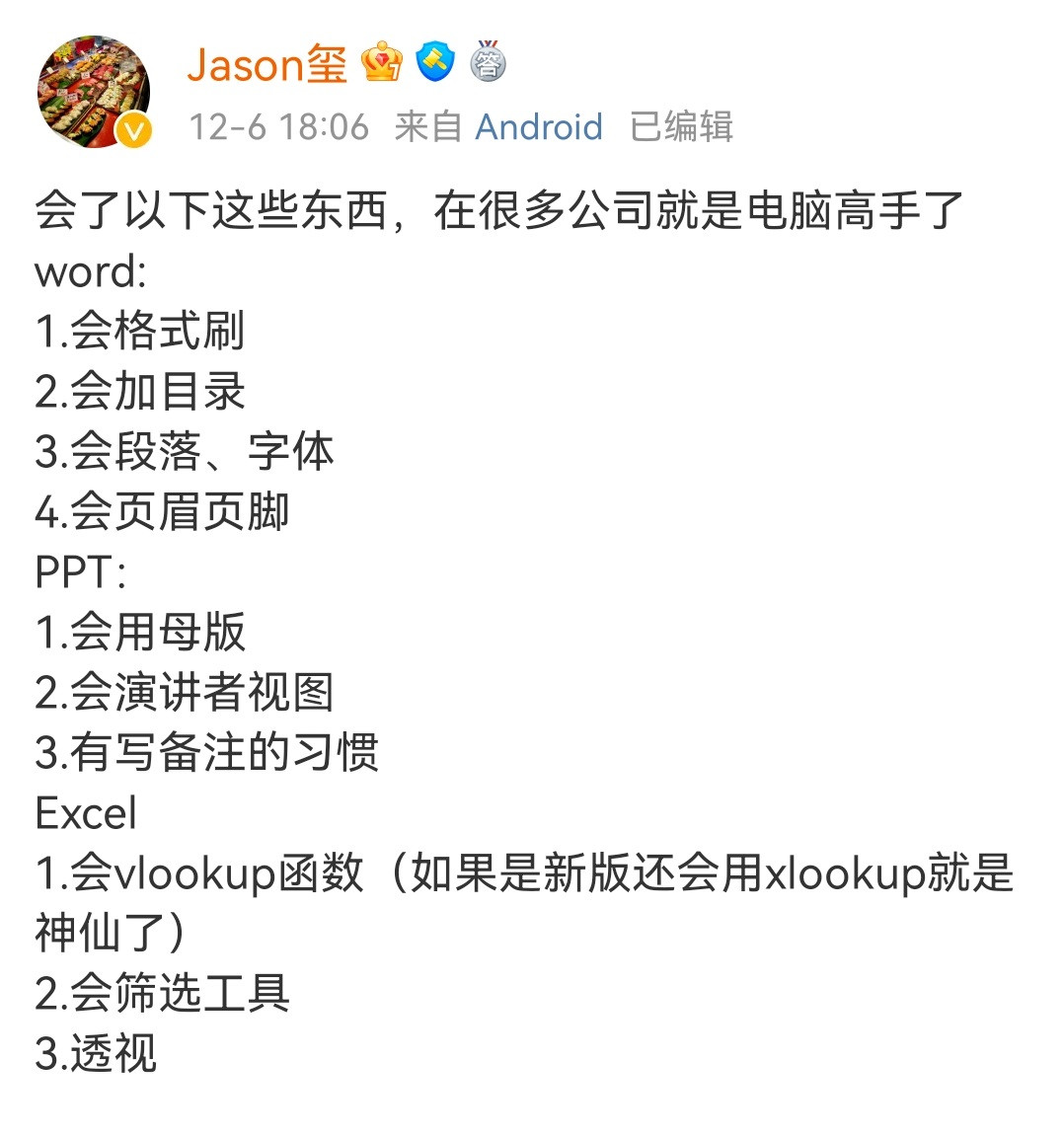@Jason璽 還列出了一些技能,稱掌握這些就可以稱得上是“電腦高手”了。
