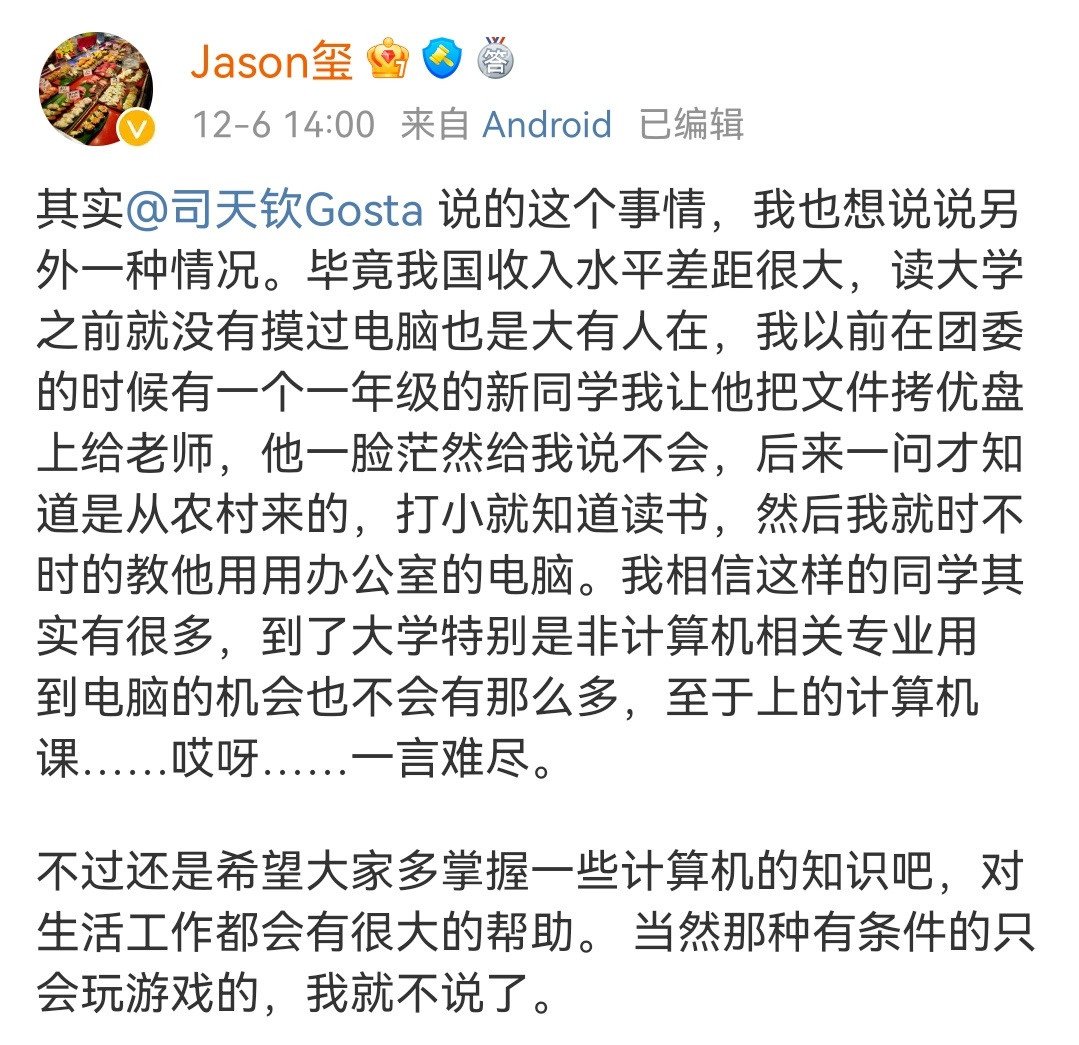 對於這個困惑,微博大V@Jason璽 是這樣解釋的,他認為這與中國發展的不平衡有關,“讀大學之前就沒有摸過電腦的大有人在”。