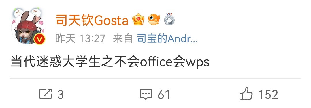 12月6日,微博大V@司天欽Gosta 發文講述了自己的一個發現,稱部分大學生不會用office,他對此感到困惑。在他看來,熟練掌握office辦公軟件是每個大學畢業生都應該具備的技能。