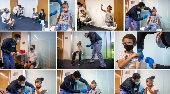 但同樣在Getty Images上出售的美國兒童接種疫苗的現場圖片,卻與這些來自中國的圖片存在着明顯的不同。比如一組拍攝於2021年11月2日的美國兒童接種疫苗的圖片,可以看到這些美國兒童表情大多平和乃至自信。