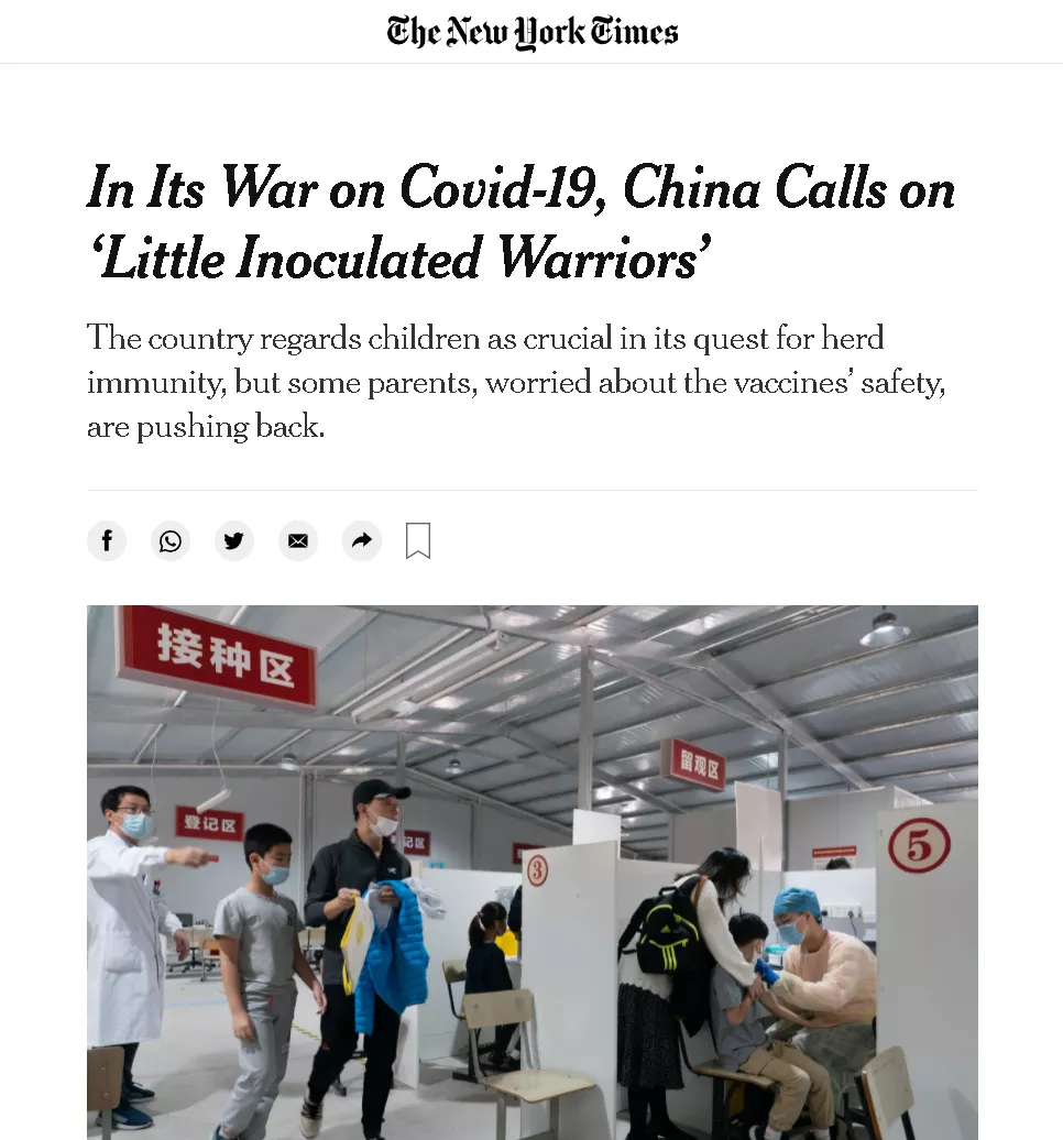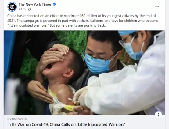 下圖,便是《紐約時報》在報道中國給少年兒童接種疫苗時,使用的那張引起了包括許多美國人在內的外國網民強烈反感的圖片。