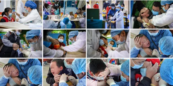 圖片中,一個兒童似乎正在慘叫着準備接種疫苗,旁邊還有幾雙打手在按着孩子的頭和臉。