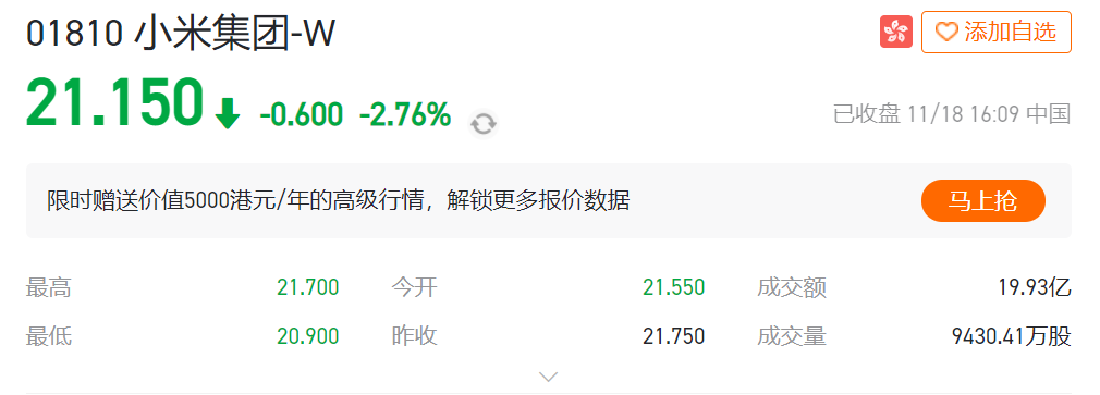 2021年以來,小米從35.9港元/股的新紀錄一路下跌,跌幅最大時超過了44%,市值蒸發3279億元。
