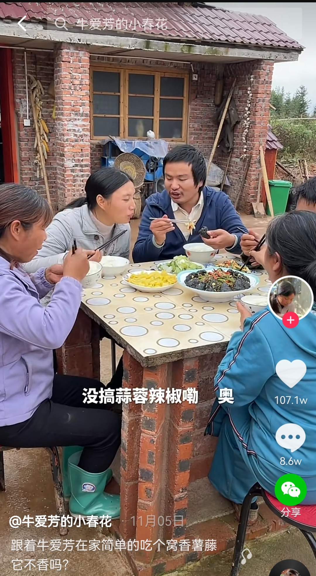 牛愛芳的小春花主打的也是鄉村生活內容,在他們的視頻裏,一家人的生活既踏實又温馨,農村生活其樂融融又富有煙火氣,簡直是世外桃源般的存在。