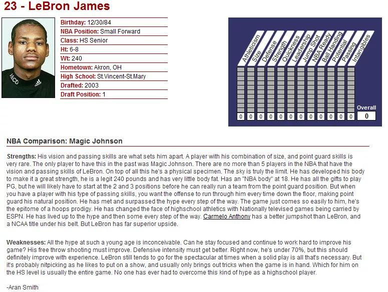 以NBA球員勒布朗·詹姆斯為例,他的球探報告中除了場均數據之外,還包含了球員技術特點、習慣、乃至性格上的優缺點,且十分詳盡。