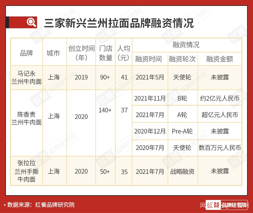 2021年,資本愛上了麪條,尤其青睞“蘭州拉麪”,有3個新興拉麪品牌都獲得了高額融資,它們分別是馬記永、陳香貴、張拉拉。