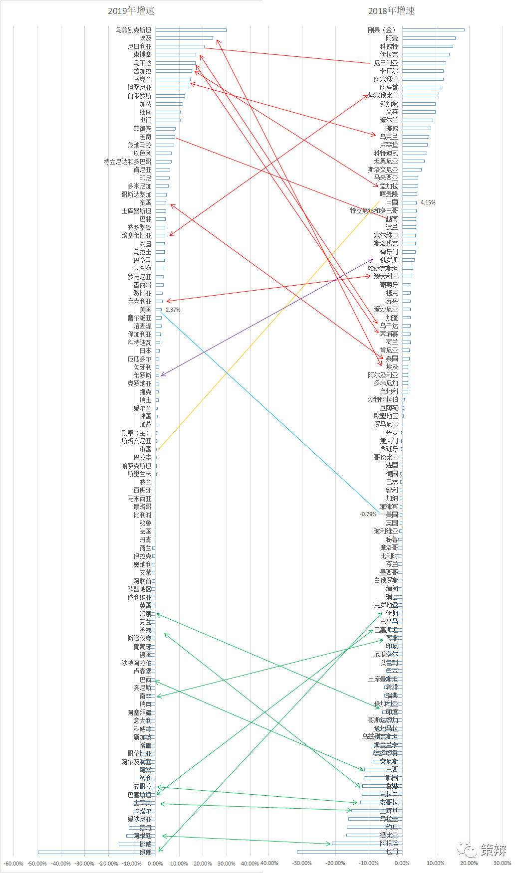 8.中國突破美國老巢還需時日。南美和歐洲是美國過往重點投入資源經營打造的“後院”,中國近年在上述地區有所突破,比如南美的阿根廷,歐洲的希臘。而這2國在2018、2019年中美貿易戰中,也是被美重點打擊對象。阿根廷2018年增幅倒數第二,2019年倒數第三。希臘也是連續2年較大幅度負增長。