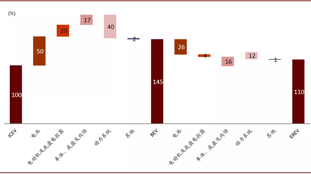圖:BEV、EREV技術路線相對於傳統燃油車(ICEV)在整車BOM成本對比。來源自:中金點睛。