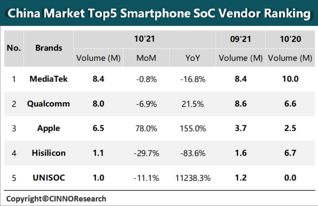 據CINNO Research數據,2020年10月時,聯發科尚能以1000萬顆的出貨量穩居第一,高通在同一時期的出貨量僅為660萬顆,但在2021年10月,聯發科出貨量就同比降了16.8%,為840萬顆,高通10月出貨量則同比增21.5%至800萬顆。