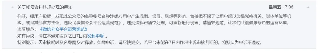 此公眾號的名稱涉嫌對用户產生混淆、誤導、聯想等影響,包括但不限於讓用户誤以為是黨政機關、媒體單位等機構,或是其他官方主體,違反《微信公眾平台運營規範》,違規資料已清空處理,可重新進行設置。