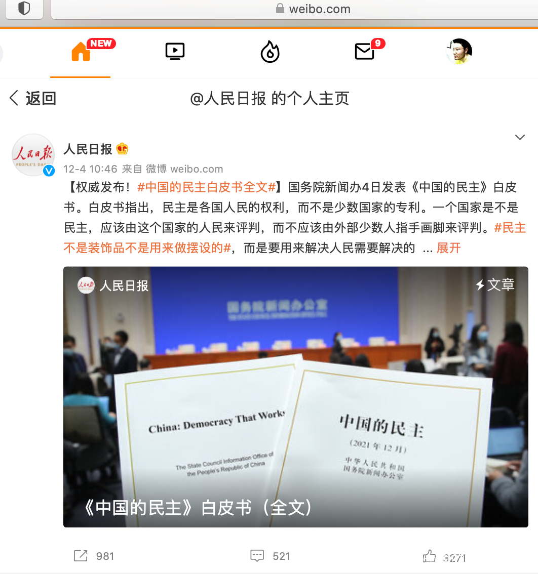 3,《“中國的民主”白皮書》:國務院新聞辦公室,見新浪微博賬號“人民日報”於2021年12月4日發佈的題為“《〈中國的民主〉白皮書(全文)》”的內容https://weibo.com/ttarticle/x/m/show/id/2309404710633328476784?_wb_client_=1