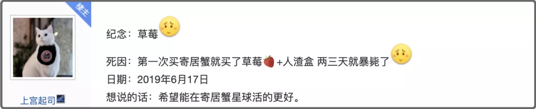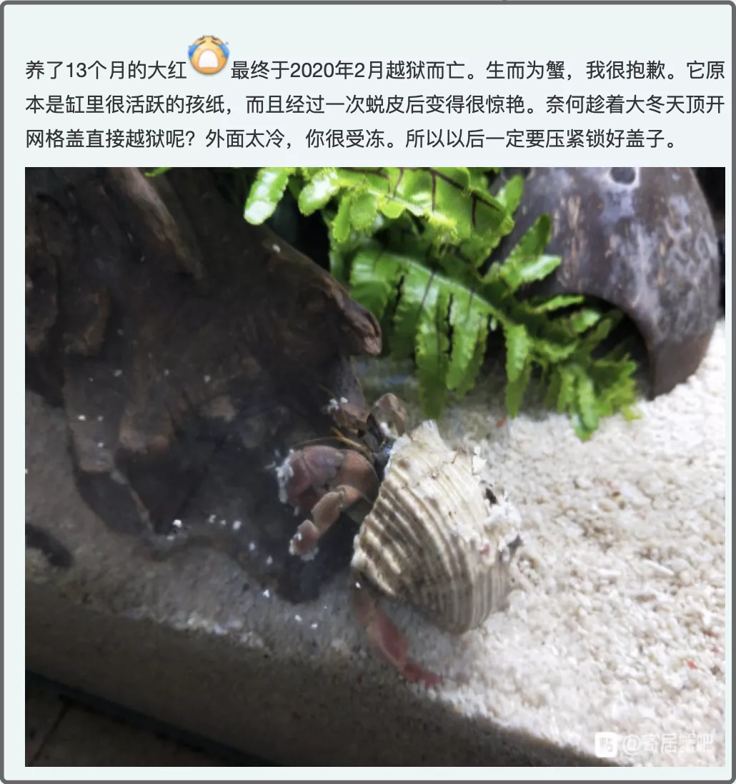 百度寄居蟹吧更是為寄居蟹開闢了一片墓園,曾經的主人們在這裏帶着自責、悔恨、無奈、懺悔的心情在這裏寫下悼詞,紀念他們死去的愛蟹。
