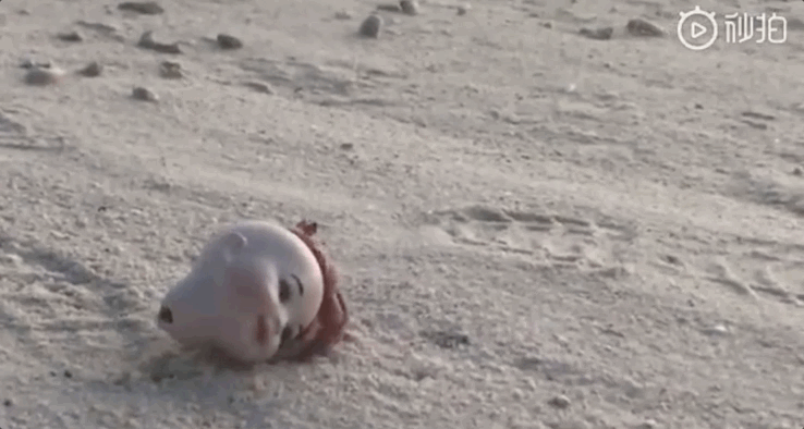 於是我們還能看到滑稽的一幕:一隻嬌弱的寄居蟹拖着一個幾倍於自己人頭,正在悲壯地向大海的方向邁去。