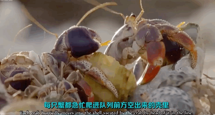 之後,一項偉大的繼承儀式開始了。最大的蟹搬進新的大房子裏,它空出來的二手房便留給下一位,依次類推。