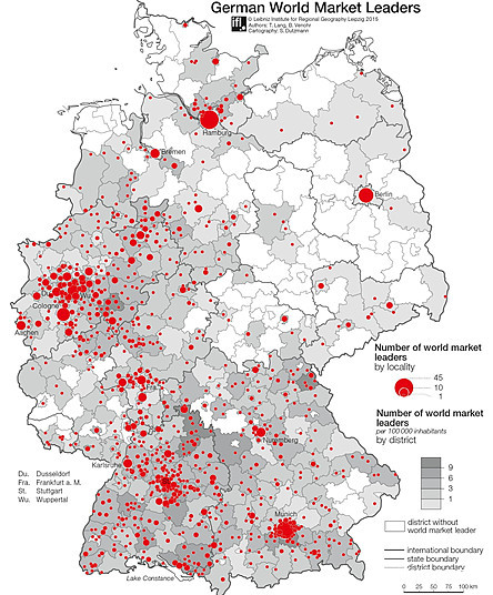 德國中小企業中隱形冠軍企業的地理分佈圖