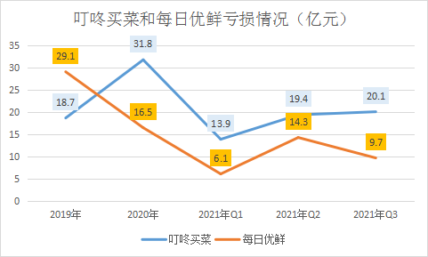 直接引爆點是兩者Q3財報釋放出來的信息——2021年Q3,叮咚買菜和每日優鮮收入分別為61.9億元和21.2億元,經營虧損則分別為20.189億元和9.707億元。