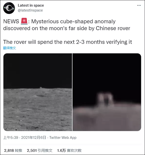 不僅國內網友好奇,此事更是提起了國外網友的興趣。推特上一個名為“Latest in space”天文資訊賬號就發佈推文,介紹了玉兔二號在月球發現“神秘小屋”的消息,截至北京時間12月6日晚間10點,該條推文獲得了超過2800次轉發、2500次引用以及1.6萬個點贊。
