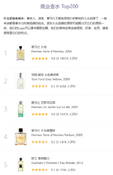 在國內香水消費者較為集中的平台“香水時代”上,根據消費者評分出具的商業香排行榜單TOP5分別是大地、灰色香根草、尼羅河花園、大地香精版、香根魅力,這五款香水的香調都屬於較為淡雅的柑橘、花香、果香、木質,其中三款香水出自同一個傳奇調香師“JCE”之手,但這個作出三款深受國內消費者喜愛作品的調香師,到了真正的東方香調作品又顯得有些捉襟見肘。