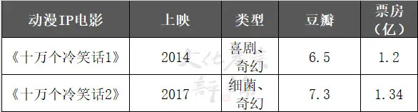 儘管有妖氣曾經憑藉《十萬個冷笑話》《鎮魂街》《端腦》等多部原創漫畫名噪一時,這些知名動漫IP的動畫、網劇或大電影的改編也為有妖氣賺足人氣,尤其是2014年與2017年,院線動漫電影《十萬個冷笑話》第一部與第二部相繼上映,兩部影片口碑與票房雙豐收,豆瓣評分分別是6.5、7.3,票房成績分別是1.2億元、1.34億元。但**《十萬個冷笑話2》的上映,是有妖氣的絕對高光時刻,自此以後,有妖氣動漫IP影視化明顯進入了停滯期。**