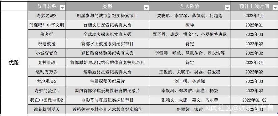 優酷顯然在這種“紀錄片+明星”的結合中嚐到甜頭。在其公佈嘉賓陣容的10部紀錄片中,當紅明星的參與是一大共性:其一,“脱口秀”基因充足,李雪琴、呼蘭、楊笠等接連出現在《奇妙之城2》《小城變變變》《奇妙的蛋生》等多檔綜藝中;其二,大咖充足,甄子丹、成龍、張頌文、姜文等坐鎮《俠客行》《我在中國做電影》;其三,王俊凱、關曉彤、佟麗婭等同樣加盟《運動萬萬歲》等節目。