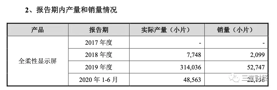 招股書還披露了,在報告期內,柔宇科技的全柔性顯示屏,2018年產量為7748片,銷量為2099片;2019年產量為314036片,銷量僅為52747片;2020年1-6月產量為48563片,銷量為22136片。從趨勢來看,2020年整年產量可能不及2019年,銷量甚至可能趕不上2019年。