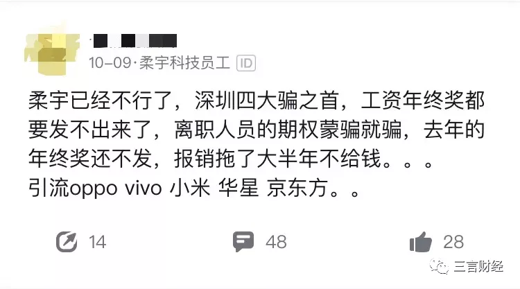 脈脈上,也有認證為柔宇科技員工的網友稱,柔宇科技是深圳四大騙之首,工資年終獎都要發不出來了,離職人員的期權能騙就騙,去年的年終獎還沒發,報銷拖了大半年不給錢。