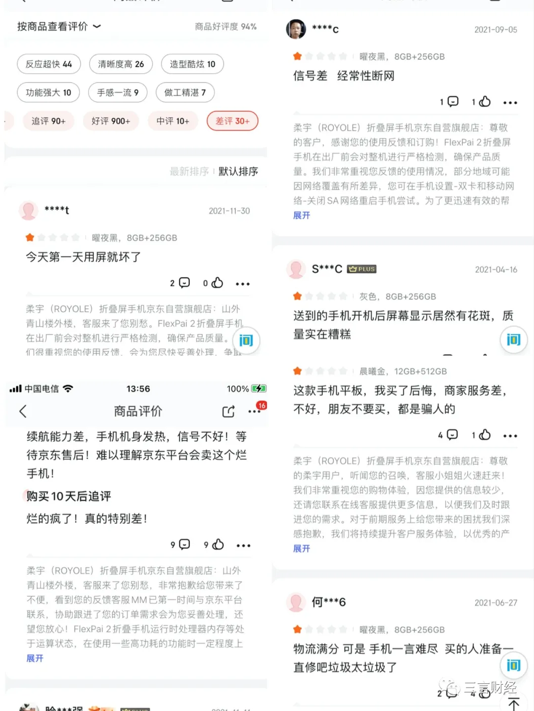 雖然柔宇科技的摺疊屏手機好評度有94%,但從為數不多的差評中,也能反映出一些問題。比如:信號差、續航能力差、屏幕有瑕疵、商家服務差……