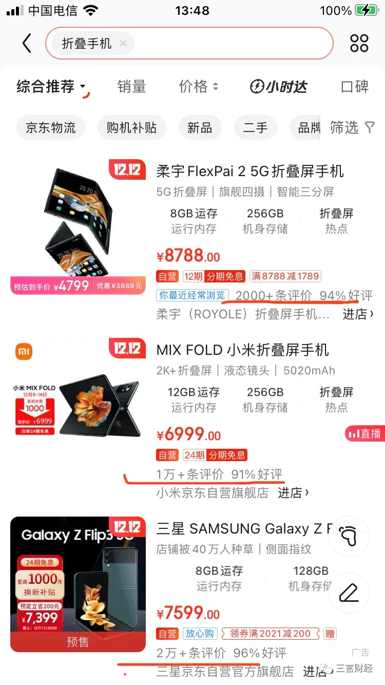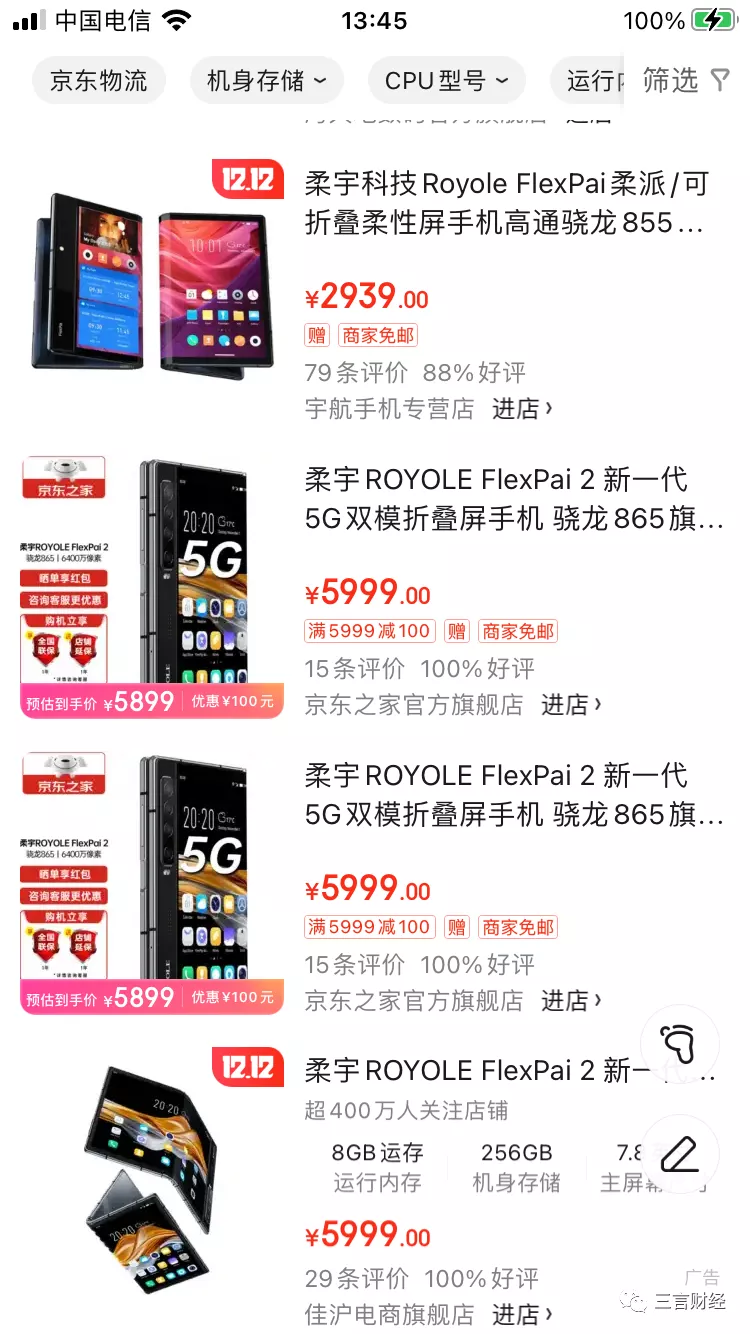 在京東自營店,柔宇科技的摺疊屏手機銷量僅為2000+,而小米的摺疊屏手機銷量為10000+,三星的摺疊屏手機銷量為20000+。(京東的評價數目即是銷量)