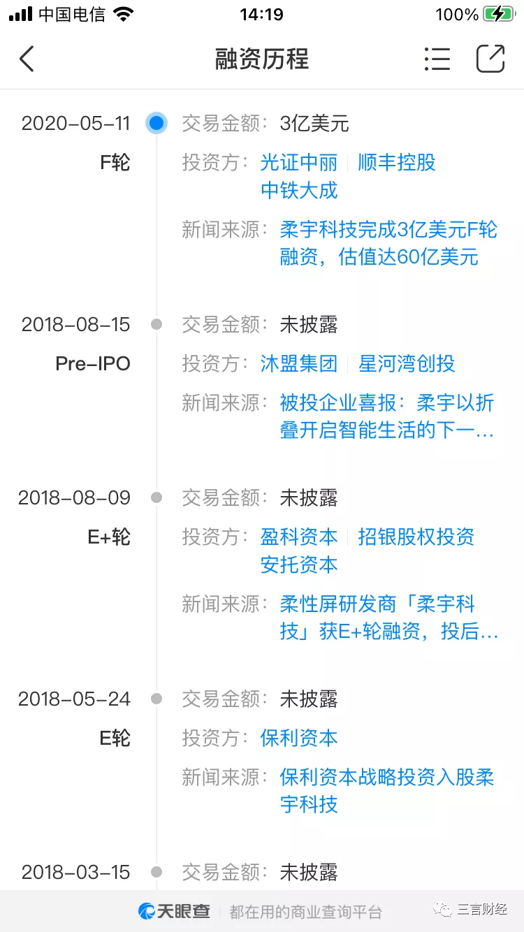 資料顯示,柔宇科技自成立以來,先後獲得13輪融資。2020年5月,柔宇科技完成3億美元F輪融資,估值達到60億美元。投資方包括光證中麗、順豐控股和中鐵大成。