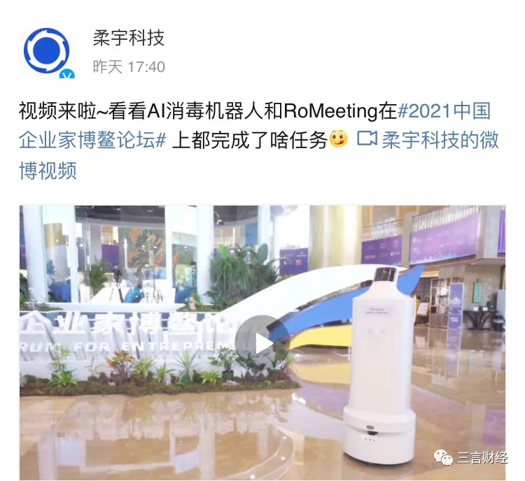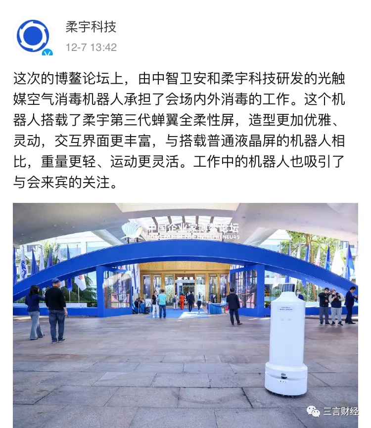 12月7日和12月8日,柔宇科技官方微博還在宣傳其和中智衞安研發的消毒機器人。稱其機器人承擔了近日的中國企業家博鰲論壇會場內外消毒的工作。
