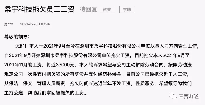 12月8日早上,有一位自稱是柔宇科技人力管理的網友,在“領導留言板”給深圳市龍崗區委書記留言稱,自2021年9月開始,深圳市柔宇科技股份有限公司拖欠工資,目前拖欠其2021年9月至2021年11月的工資,將近33000元。
