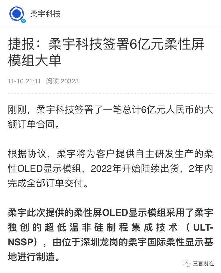 值得一提的是,11月10日,柔宇科技剛剛發佈捷報稱,剛剛簽署了一筆總計6億元人民幣的大額訂單合同。根據協議,柔宇將為客户提供自主研發生產的柔性OLED顯示模組,2022年開始陸續出貨,2年內完成全部訂單交付。但柔宇科技未透露客户名字。