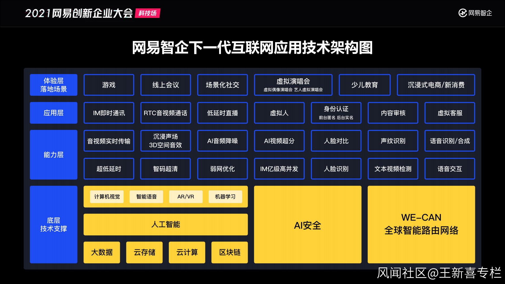 在會上,網易智企展示了它在下一代互聯網的技術架構佈局,從底層技術到能力層(音視頻實時傳輸、沉浸聲場、超低時延、文本視頻檢測等)、應用層(IM即時通訊、虛擬客服、內容審核等)、體驗層場景(線上會議、場景化社交、沉浸式電商等)均有了全面的佈局與應用落地。