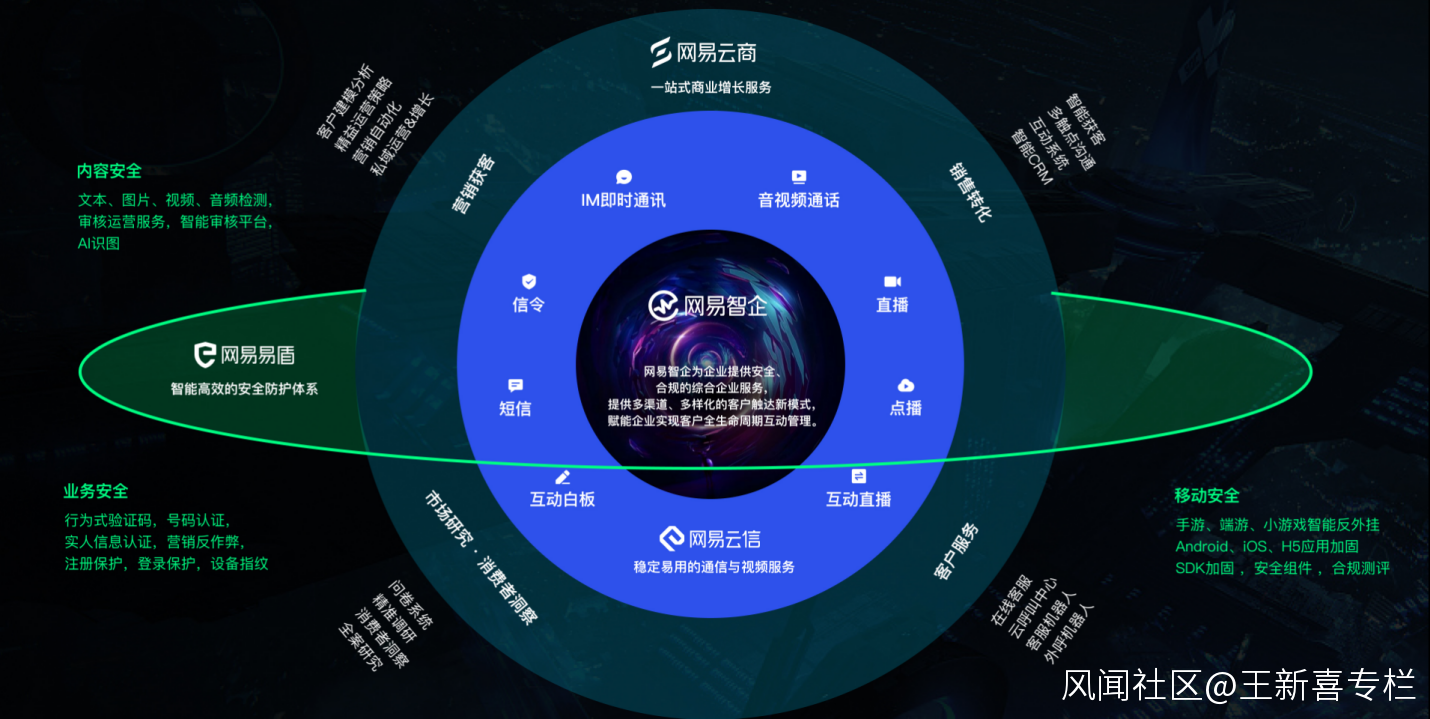 從網易智企的佈局來看,它走的是安全、技術、商業服務一體化的融合路線——依賴網易易盾、網易雲信、網易雲商的安全服務、融合通信技術與商業增長解決方案重構企業價值鏈作為To B的基本思路。