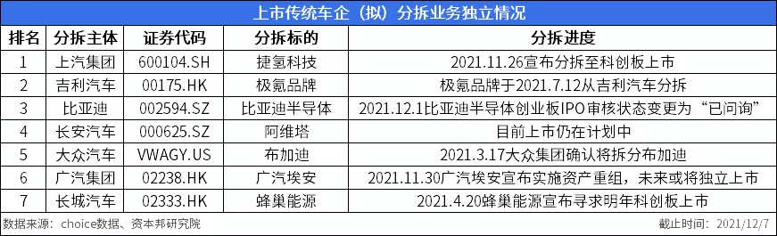 據資本邦不完全統計發現,自2019年12月13日證監會發布《上市公司分拆所屬子公司境內上市試點若干規定》以來,截止2021年12月7日,共有7家傳統上市車企宣佈了將部分業務獨立運營的計劃,且分拆出來的資產絕大多數都涉及新能源業務。