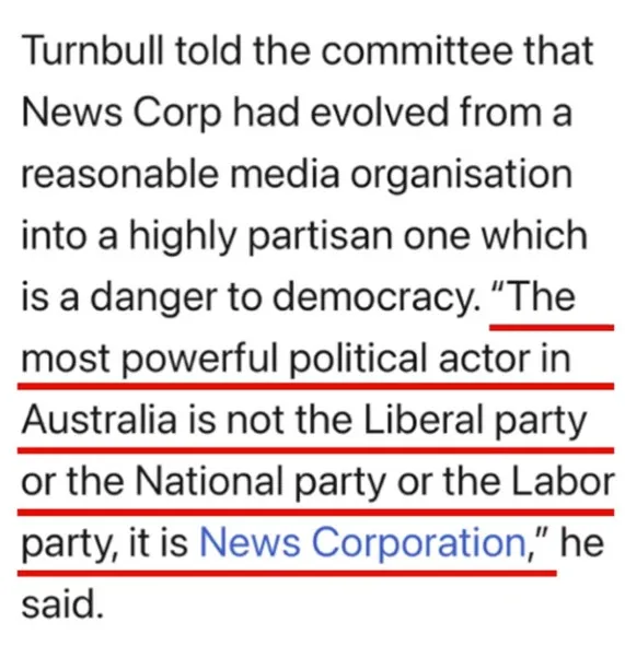 特恩布爾無奈表示:“澳大利亞最強大的政治行為者不是自由黨、國家黨或工黨,而是新聞集團。”