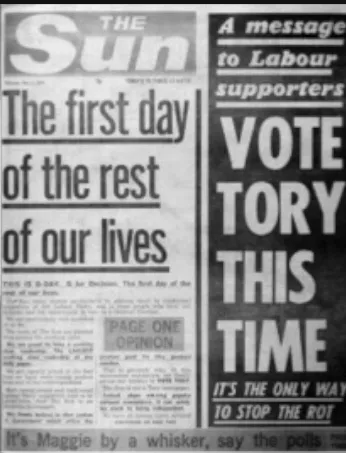 在1979年5月3號選舉日當天,《太陽報》用了整版篇幅在頭版發表了社論支持撒切爾夫人,聲稱“這次選舉只有投保守黨人的票,才是終止騷亂的唯一途徑”。(Vote Tory This Time. It’s the only way to stop the riot.)
