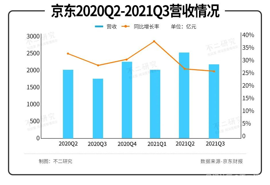 據京東三季報數據顯示,其今年第三季度實現總營收2187.08億元,同比增長25.54%。2021年Q1和Q2營收則分別為2031.76億元,2538.00億元,分別同比增長38.97%和26.23%。