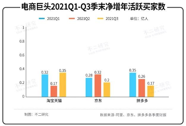 據財報顯示,阿里、京東和拼多多2021年前三季度的季末淨增年活躍買家數量分別為0.84億、0.80億和0.78億人,京東年活躍用户增長數處於中位。