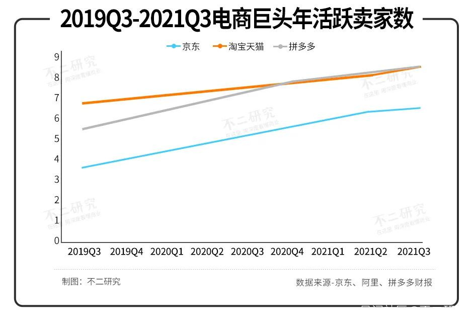 若從年活躍買家絕對數量角度看,京東已經被阿里和拼多多拋之腦後。據財報顯示,截至2021年Q3,阿里、拼多多、京東年活躍買家數分別為8.63億、8.67億、5.52億。