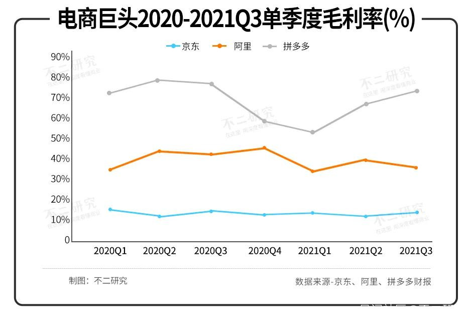 因此,京東的利潤率遠低於阿里和拼多多,據三季報顯示,京東、阿里、拼多多2021年第三季度的毛利率分別為14.22%,35.35%,69.50%。