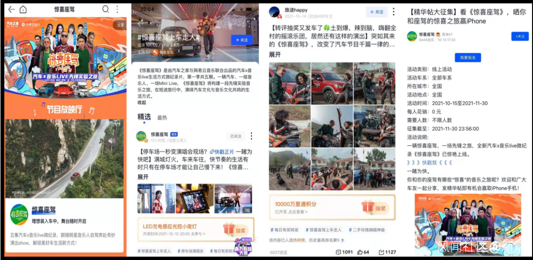 比如汽車之家在自家社區發起「驚喜之旅同款打卡」「看節目聊座駕」等大小十餘種活動,將節目所傳遞的美好車生活理念進一步滲透,刺激用户分享、創作的慾望,並通過專題頁面聚合,在高頻次觸達入口長期展示沉澱。