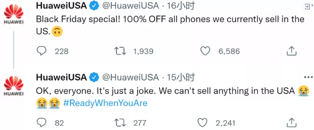 想必大家還記得,上個月華為在社交平台上連續更新了兩條官方推文,其一是“黑五特價!我們目前在美國銷售的手機統統零元購!”