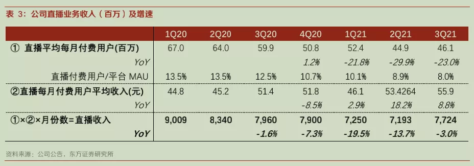 不過,付費用户的ARPPU提升也很明顯,這很可能與採購內容和新興主播的崛起有關;而2021Q3直播收入在連續至少6個月下降後首次實現環比7%的增長,也可能意味着一個新的直播生態和秩序的形成。