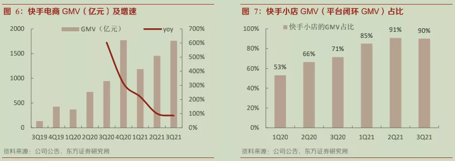 快手的最大商業潛力還是在於電商業務,這幾乎就是快手打出的明牌。2021Q3,快手直播電商的季度GMV大概在1700億左右(大概年6800億GMV),貨幣化率為1%。