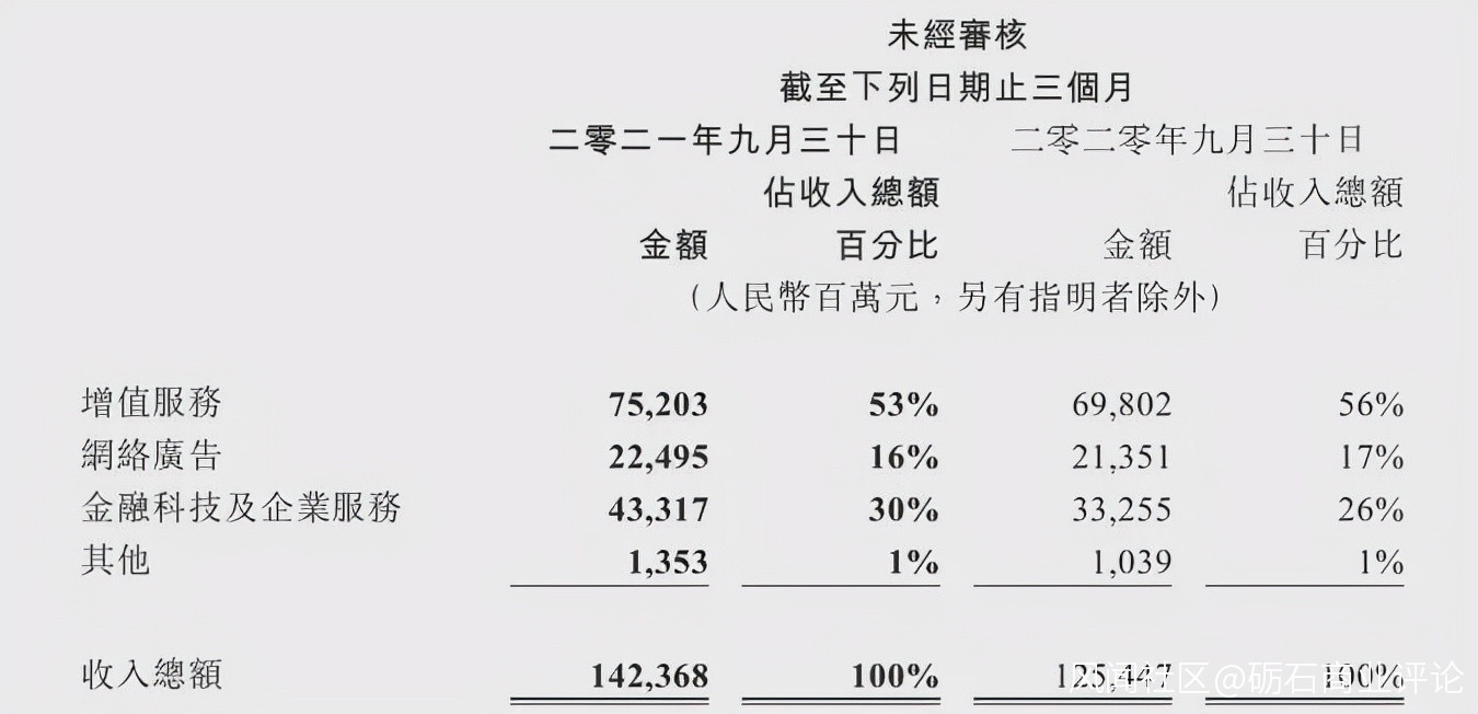 從營收構成上看,騰訊主營收入分別為增值服務、網絡廣告以及金融科技及企業服務三部分組成。其中,增值服務又包括遊戲和社交網絡收入(視頻、音頻等用户付費收入)兩部分。