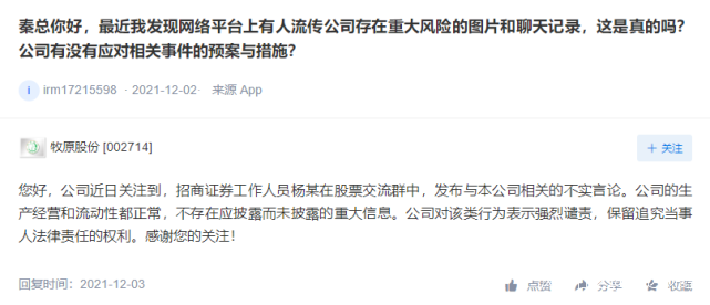 儘管該員工此後反覆澄清自己所述為道聽途説,沒有任何依據,但相關言論還是被投資者放到互動平台用於諮詢上市公司。對此,牧原股份回覆稱言論不實,公司生產經營和流動性都正常。