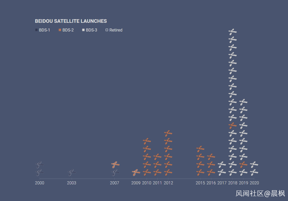 第一代北斗衞星在2000-03年間發射,共有4顆,都是高軌道的,在赤道同步軌道運行,覆蓋中國及周邊地區,現在已全部退役。第二代北斗衞星在2004-12年間發射,覆蓋亞太地區,共有4顆赤道同步衞星,5顆傾斜同步衞星,5顆中軌道衞星,已有部份開始退役。第三代北斗,覆蓋全球,共有3顆赤道同步衞星,3顆傾斜同步衞星,24顆中軌道衞星,在2020年6月23日完成組網。